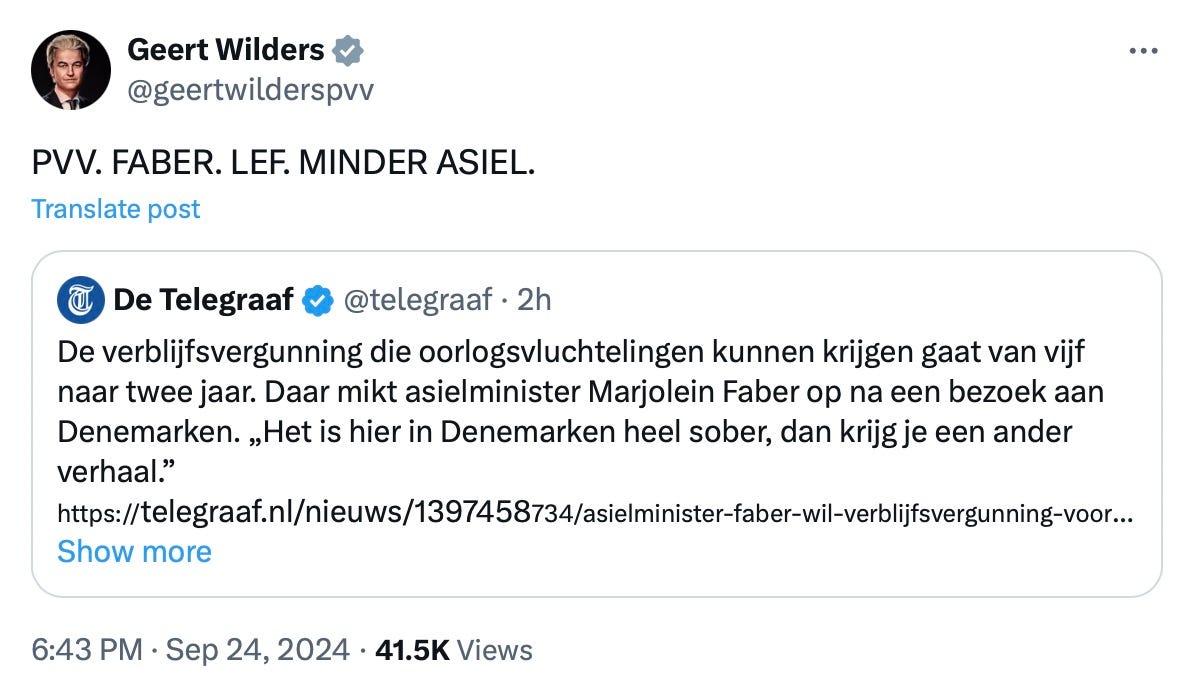 Terwijl de minister van Asiel en Migratie op werkbezoek in Denemarken is om te kijken wat Nederland kan leren van het strenge en sociaaldemocratische asielbeleid in LEGO-land, wordt een voorgenomen en aangekondigde noodwet in ons land nu post-regeerakkoord afgezwakt tot een spoedwet. Maar dat is voor Wilders dus onvoldoende en hij heeft gunstige peilingen als fundament onder zijn gelijk.
