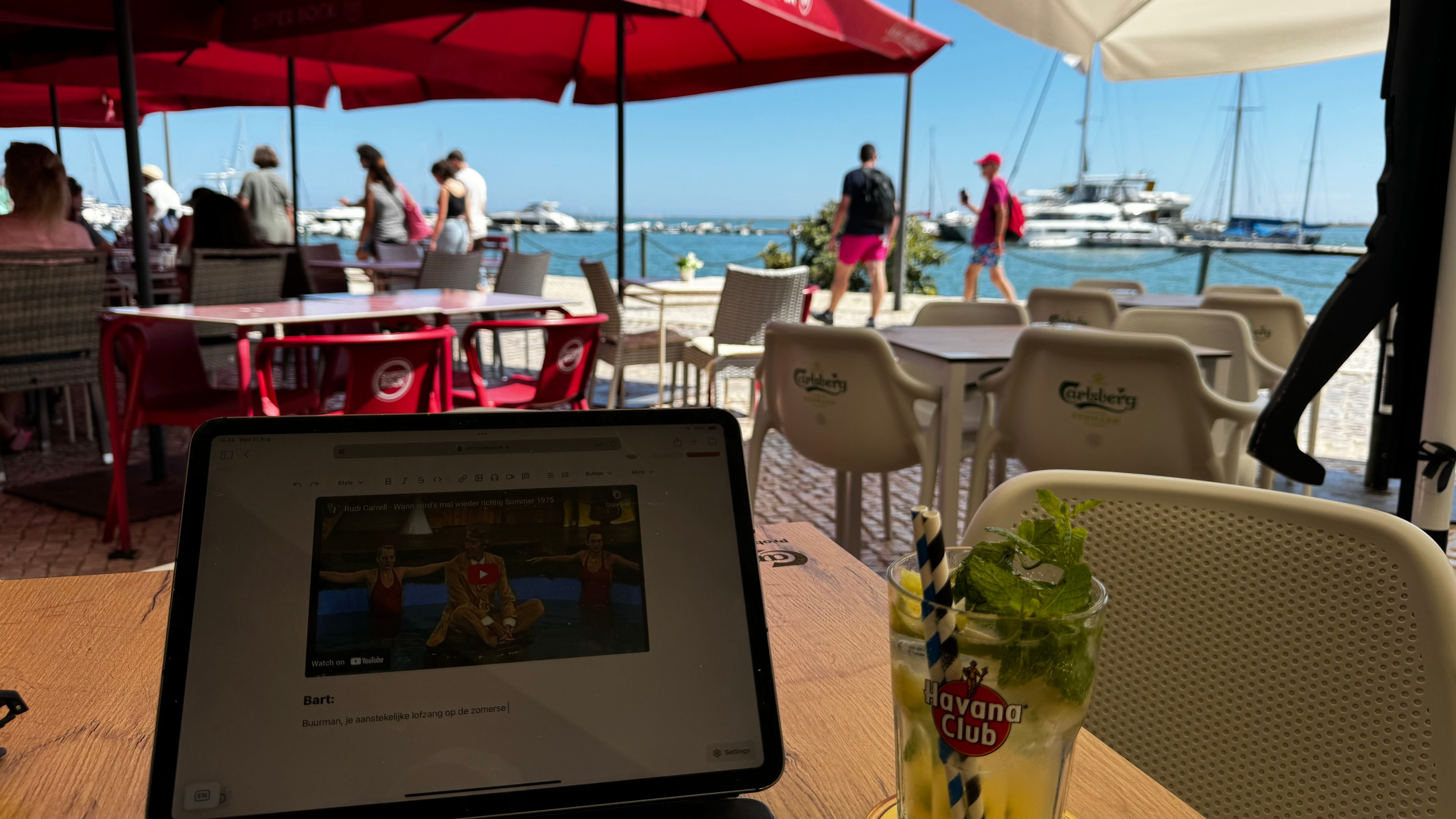 Buurman, je aanstekelijke lofzang op het zomerse rumoer in onze contreien noopten me onmiddellijk iets te doen dat ik ondanks de zonnige situatie alhier al een tijdje niet meer gewoon ben: ik ben terstond naar Olhão gereden, waar ik de voiture in de laatste goed-bewaard-geheime, altijd-plek-parking onder de Pingo Doce heb gemanoeuvreerd, om op het terras van de Cantaloupe een fijne mojito te bestellen terwijl ik het toerisme gade sla om er over te kunnen berichten in deze Portugal Post. Zie alhier het fotografische bewijs: