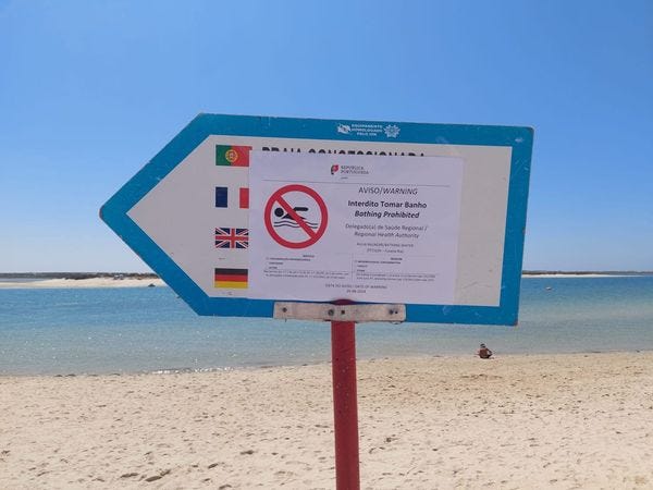 God straft soms, helaas niet onmiddellijk, maar de afgelopen dagen zat er zoveel stront en pis in het zeewater van onze streek dat een aantal strandjes in onze biotoop gesloten werden wegens e-coli, dat vrolijke beestje dat slingerpoep en racekak veroorzaakt. Op veel plekken in de Algarve eindigen de rioolbuizen gewoon in de zee, een regelrecht schandaal waar niets tegen gedaan wordt door de overheid.