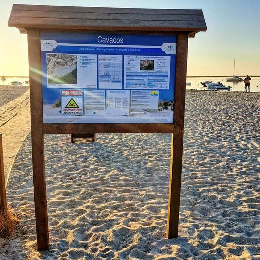 Ik ga elke dag zwemmen als het hoog water is, en er vers water van de Atlantische Oceaan stroomt in de Ria Formosa stroomt, maar met eb is het water 20 graden en een geweldige kweekvijver voor e-coli. Bon, over twee weken is het voorbij, dan zijn de vervuilers weg, met hun drollen en hun afval.