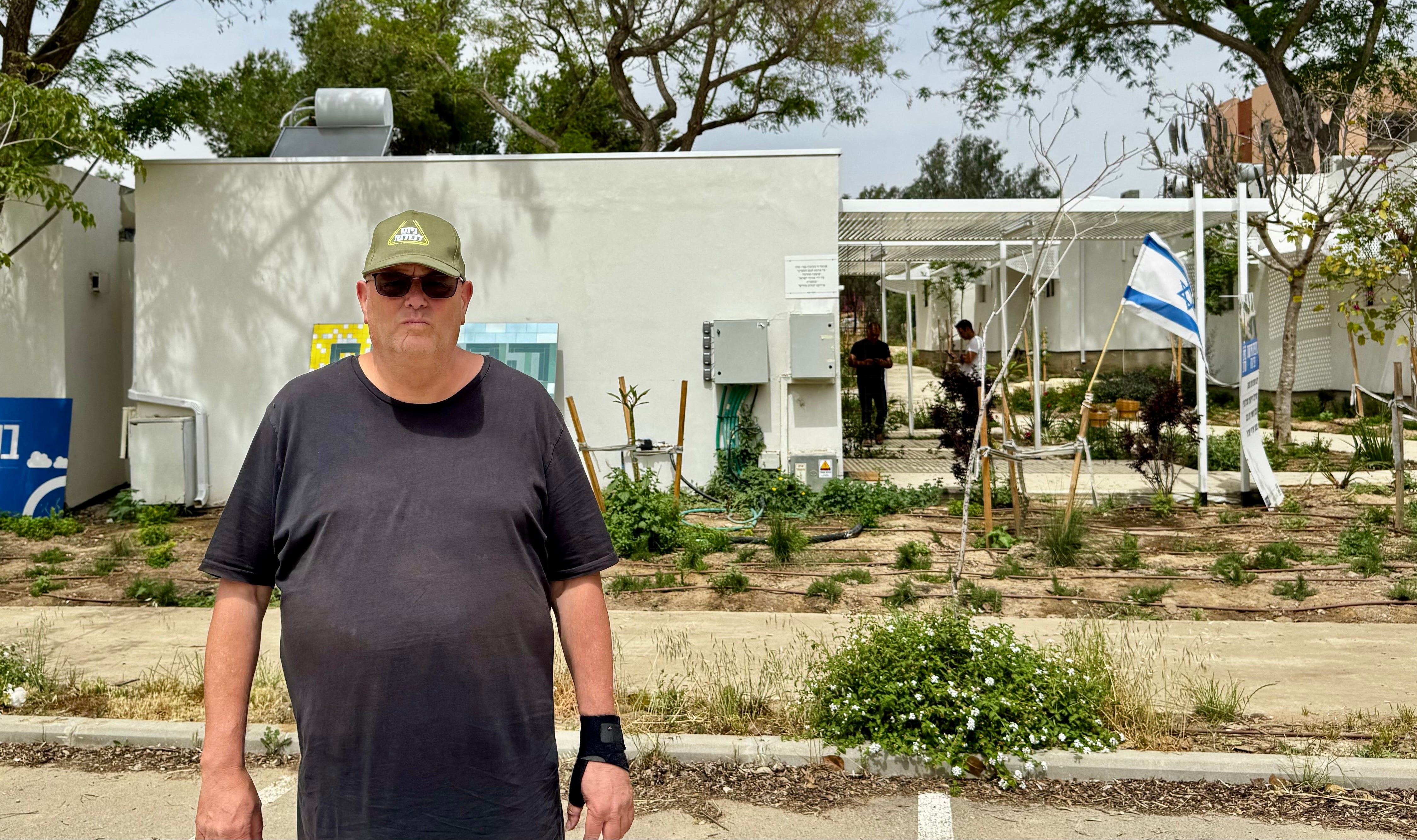 De rondleiding is, bij gebrek aan een beter woord, ontspannen. We rijden samen op zijn Club Car over de wandelpaden van de kibboets, waar het ene wijkje onberoerd lijkt maar het volgende bestaat uit doorzeefde, dichtgespijkerde woningen. Her en der zijn volledig uitgebrande huizen al afgebroken, andere woningen worden gerenoveerd maar op de meeste plekken is het stil. Het merendeel van de inwoners heeft nog altijd elders onderdak en niet iedereen wil terugkeren. “Kijk, hier wordt de tuin bijgehouden. Dat is fijn. Het was hier altijd heel netjes, maar moet je nu eens zien.” Hij gebaart met een luie arm naar overwoekerde tuinen en paden. Alsof het achterstallige hovenierswerk het ergste is.