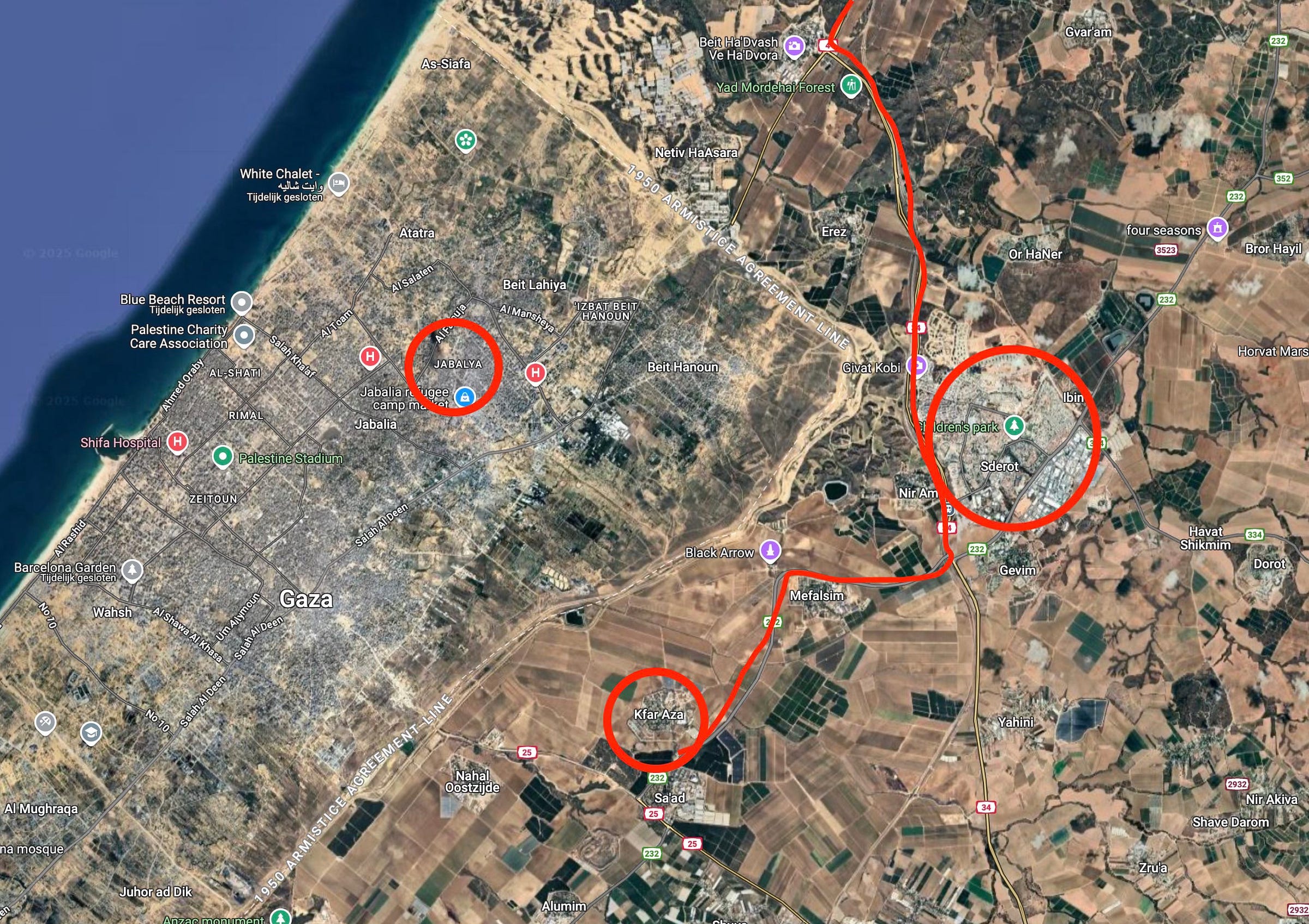 Om in het getroffen gebied te komen, neem je vanaf Tel Aviv autoweg 4 naar het zuiden. Richting de Gaza Envelope, zoals het gebied genoemd wordt. Vlak boven grensovergang Erez Crossing draai je de 34 op richting Sderot, een stadje net buiten het meest noordoostelijke hoekje van de Gazastrook. Vanaf daar neem je de weg die op Zwarte Zaterdag door dood en verderf is getekend: de 232.