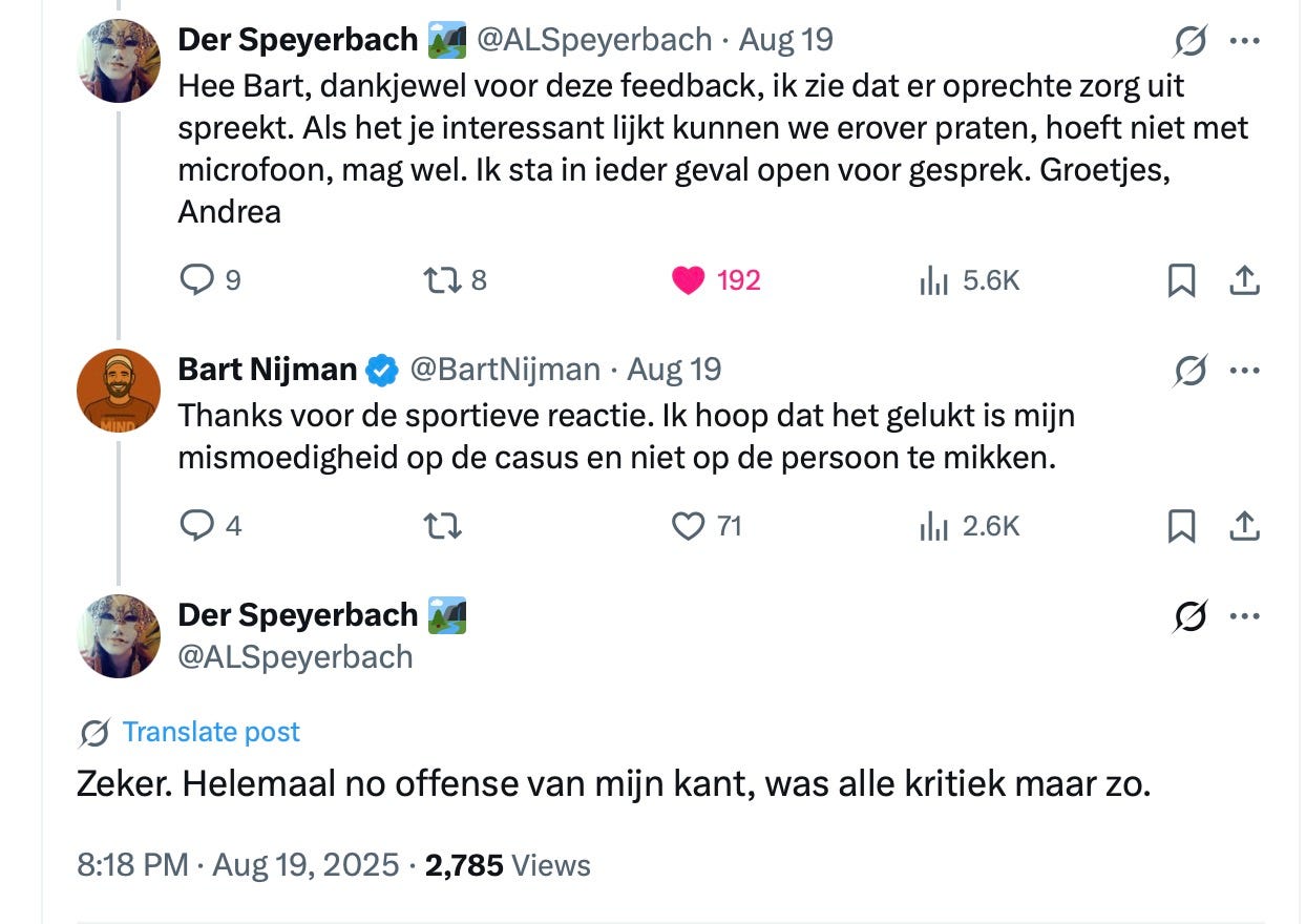 Voor de helderheid en een paar matige lezers op X: mijn kritiek richt zich niet op de persoon van Andrea Speyerbach maar op de casus die ze aandraagt (een rechtszaak) en de ohjee-daar-gaan-we-weer-manier waarop dat ogenschijnlijk uit het niets een hot topic is op rechts.