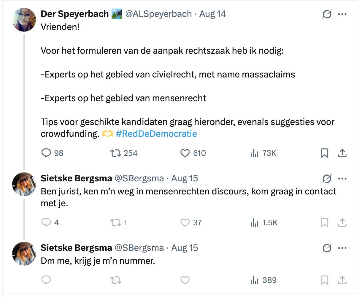 Een rechtszaak is derhalve een eindhalte, of misschien een tussenstop, maar geen vertrekpunt. Speyerbach opperde - als eenling - enkele weken geleden voor het eerst om zo’n rechtszaak te overwegen, en vroeg pas deze week om input en hulp. Op X. Zo werkt het echt niet, en zo zal het niet werken.