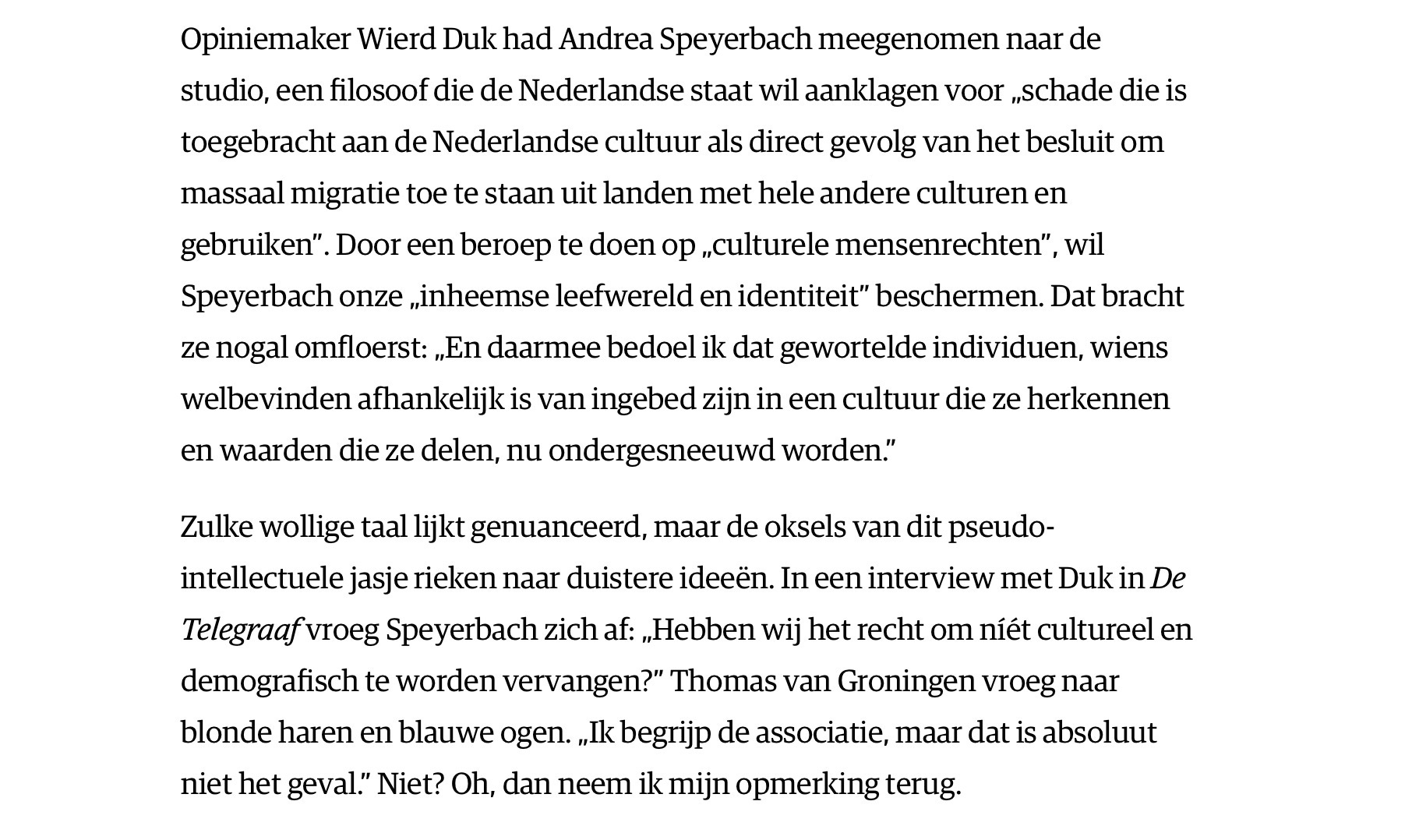 Filosofe Andrea Speyerbach verscheen uit het niets, trok een zeepkistje naar zich toe, klom daar bovenop en zei: ‘Ik ga de Nederlandse staat voor de rechter slepen voor migratieschade aan de Nederlandse cultuur’. Daar wilden Theodor en ik graag meer over weten, en enkele kritische kanttekeningen bij plaatsen.
